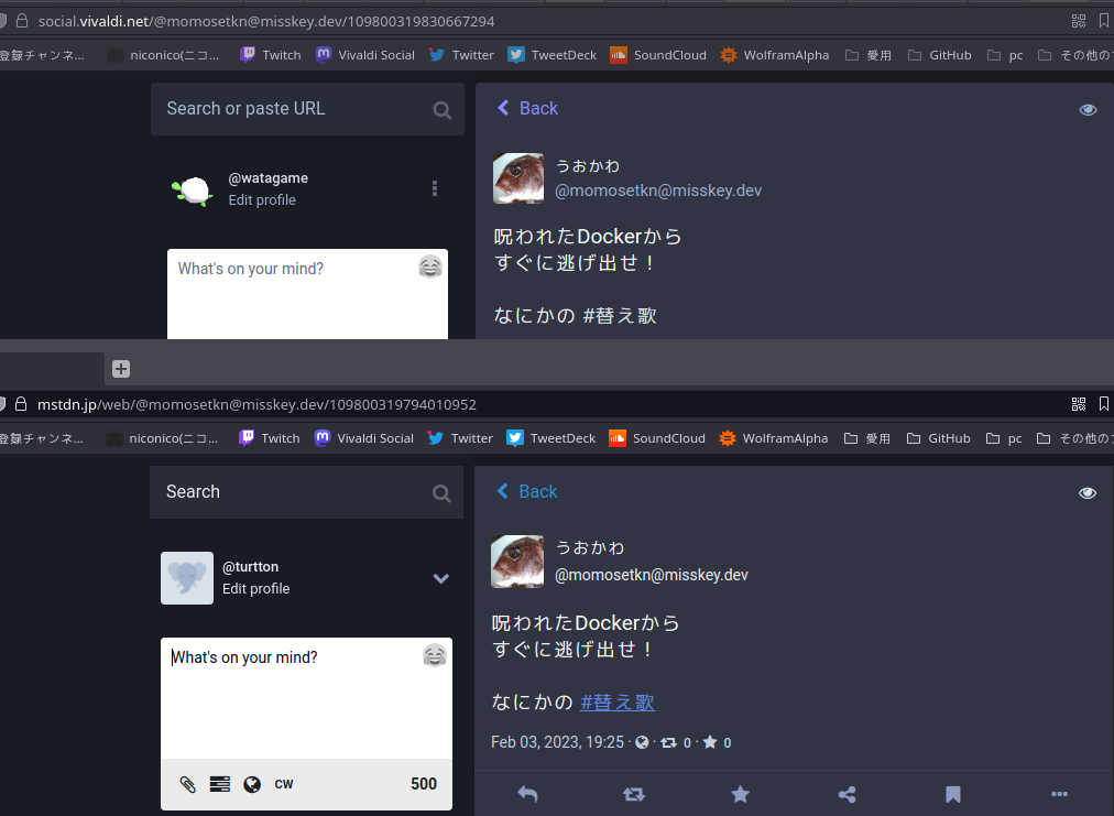 もちろん双方に互換性はないのでmisskeyからmastodonの記事を見るとmisskeyのURL形式になるしその逆ならmastodonの形式でmisskeyの記事が表示される。またmastodonでも別インスタンスから見ると同じ記事のIDが異なっていたので、おそらく記事を対象インスタンスから取得した段階で自分のインスタンスに保存していると思われる。